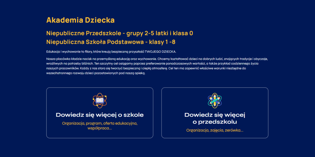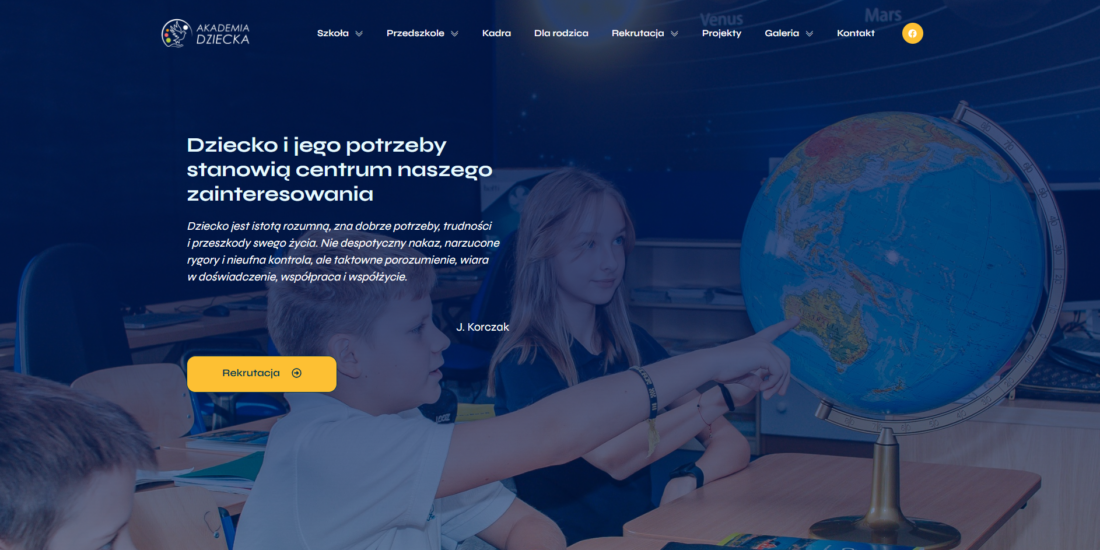 Są projekty, które od początku mają w sobie coś więcej – i właśnie tak było w przypadku Akademii Dziecka. To nowoczesna szkoła podstawowa i przedszkole, które łączy wysokie standardy edukacyjne z ciepłą, rodzinną atmosferą. Zespół Akademii zgłosił się do nas z jasną potrzebą: stworzyć stronę internetową, która będzie nie tylko estetyczna i funkcjonalna, ale przede wszystkim odda charakter tej wyjątkowej placówki.