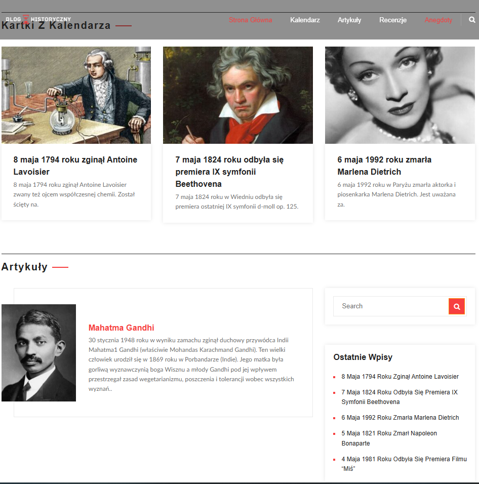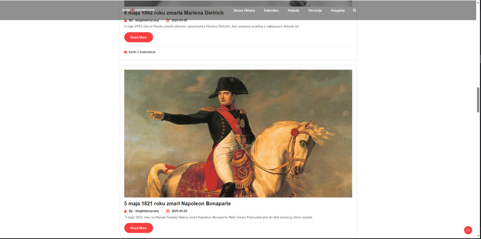Najważniejsze? Kalendarz – serce całego bloga. To właśnie on przyciąga największą uwagę. Codziennie aktualizowany, pokazuje wydarzenia, które miały miejsce danego dnia w przeszłości. Nie ważne, czy to 3 maja czy 17 listopada – każda data ma tu swoje znaczenie.
