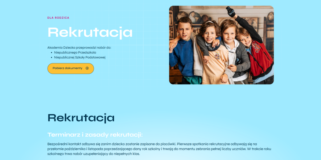 Wspólnie z klientem zaprojektowaliśmy stronę, która ułatwia rodzicom wszystko, co najważniejsze – od zapoznania się z ofertą edukacyjną po zapis dziecka do szkoły lub przedszkola. Formularze zgłoszeniowe zostały zaprojektowane tak, by cały proces był prosty, szybki i wygodny. Już od pierwszego kontaktu z witryną rodzic otrzymuje komplet informacji i intuicyjne narzędzia do działania.