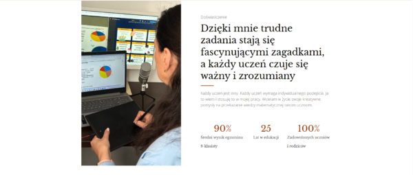 Renata z powodzeniem łączy tradycyjne metody nauczania z nowoczesnymi narzędziami, dostosowując sposób pracy do indywidualnych potrzeb ucznia. Jej zaangażowanie i skuteczność najlepiej potwierdzają wyniki – średni rezultat jej uczniów na egzaminie 8-klasisty to 90%, przy krajowej średniej na poziomie 53%.